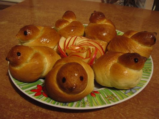на "верхнем" конце жгутика делаем клювик,на "нижнем" хвостик.перед выпечкой и после неё, смазать сахаром растворённым в очень маленьком количестве воды.