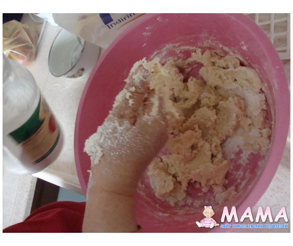 2) Ну а теперь мука, насыпаете и подсыпаете 2 ст. муки постоянно перемешивая до состояния не очень тугого теста. Вообще свекровь муку сыпет на глаз, на фото я покажу, что получается в начале, и каким становится тесто потом.