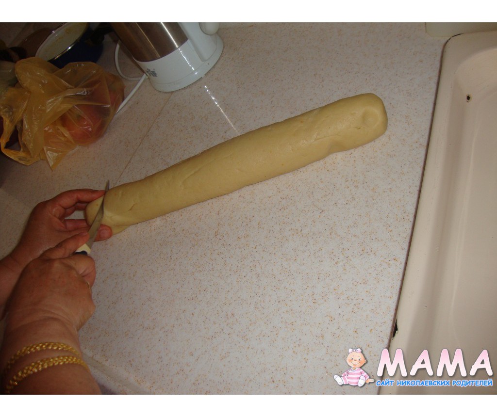 3) Готовое тесто скручиваем с колбаску, толщиной в 6-7 см.
