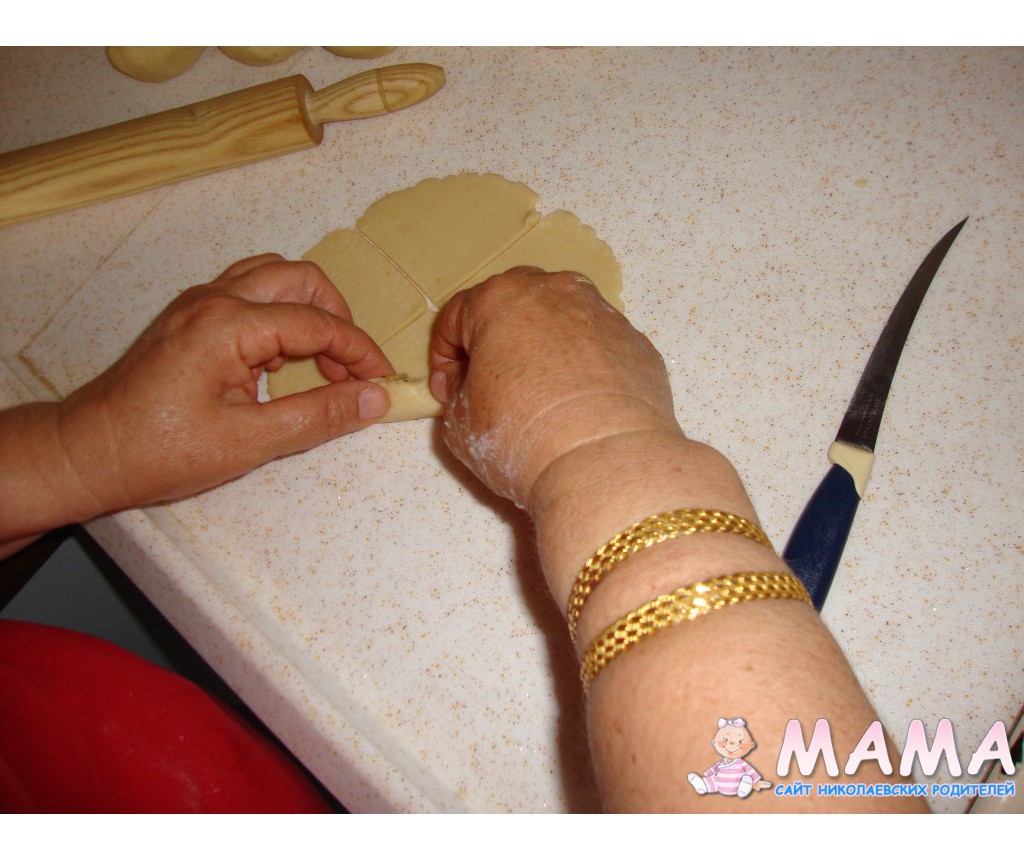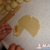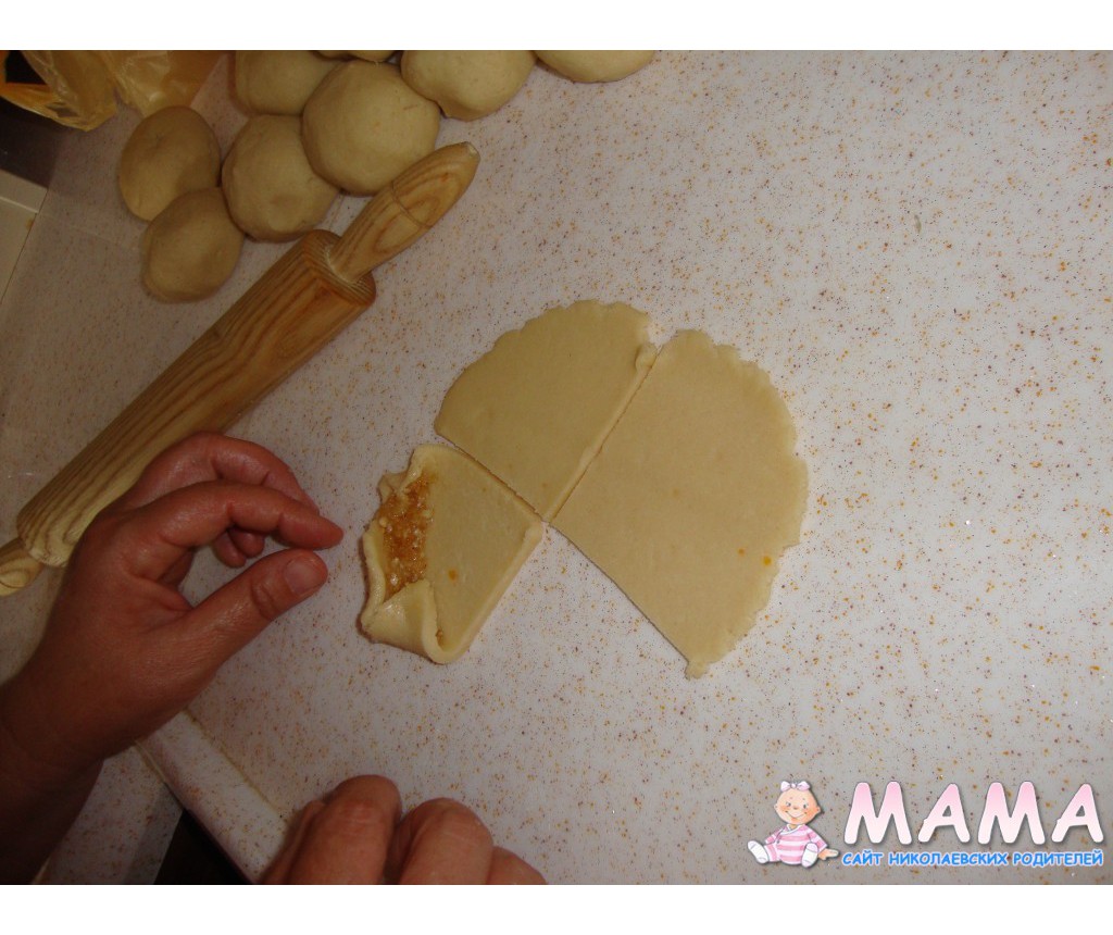 6) Шарик раскатываем в лепешечку. Разрезаем ее на 4 части, как показано на картинке, добавляем в каждую четвертинку начинку, и далее скручиваем наши печеньки так, как показано также на картинке.