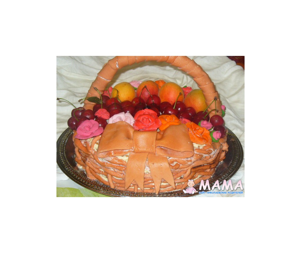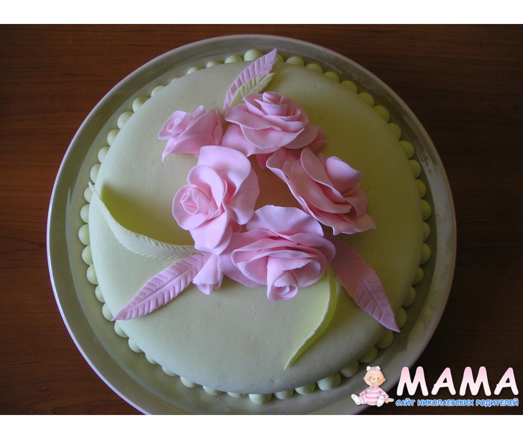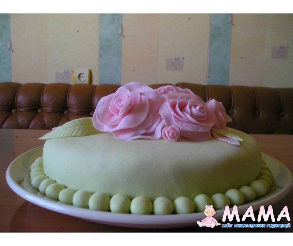 Это мой где-то пятый торт с мастикой, который делала на работу в свой день варенья(отсюда и надпись!) Было это давно, еще весной. Летом, честно говоря, не занималась мастикой вообще-жарко очень и муза не прилетала!