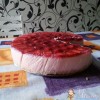 В принципе на этом все и должно было закончится, но малая не доела клубнику, и чтобы добру не пропадать, я ее порезала на части, уложила кругом сверху уже застывшего моего тортика, потом залила желе( растворила по инструкции одну пачку, мешала пока не остыла немного и залила тортик сверху, у меня получилось как раз до верха бортика)