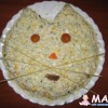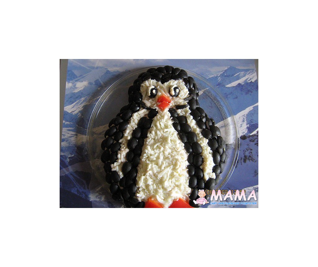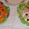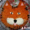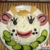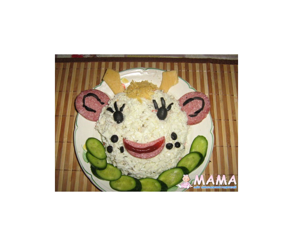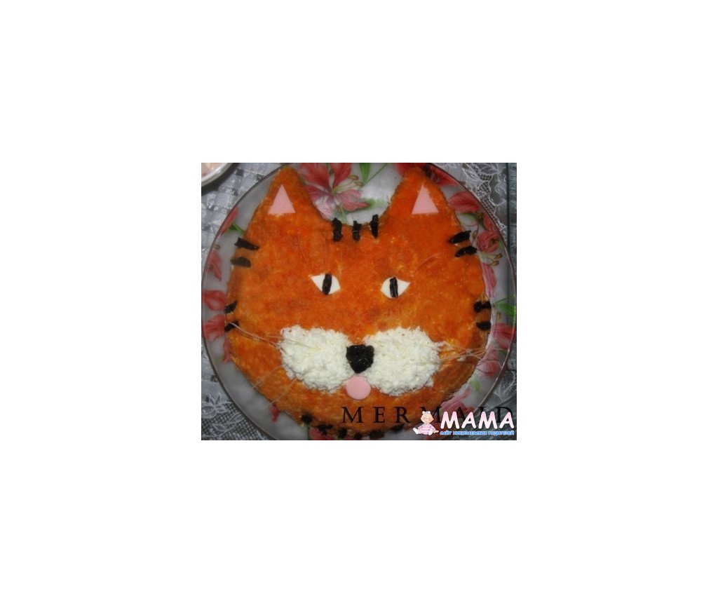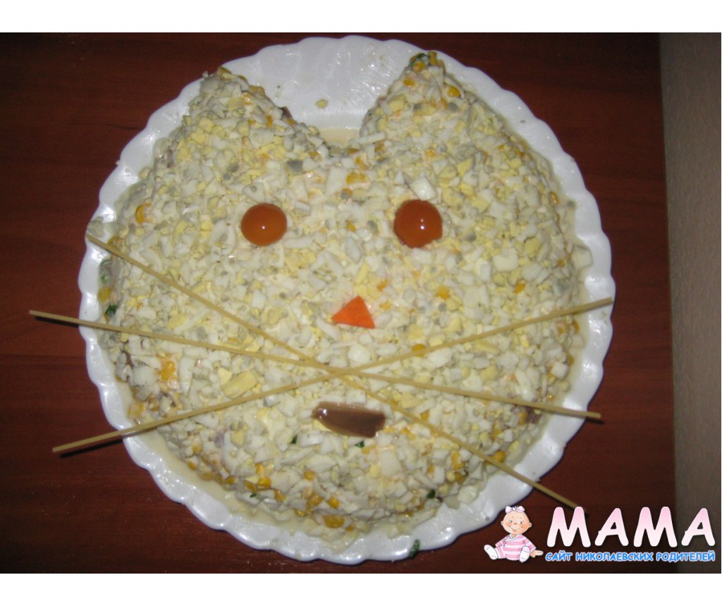 Внутри было Оливье, сверху - мелко натёртая вареная морковка, яичный белок, колбаса, чернослив; усы - рисовые макароны.