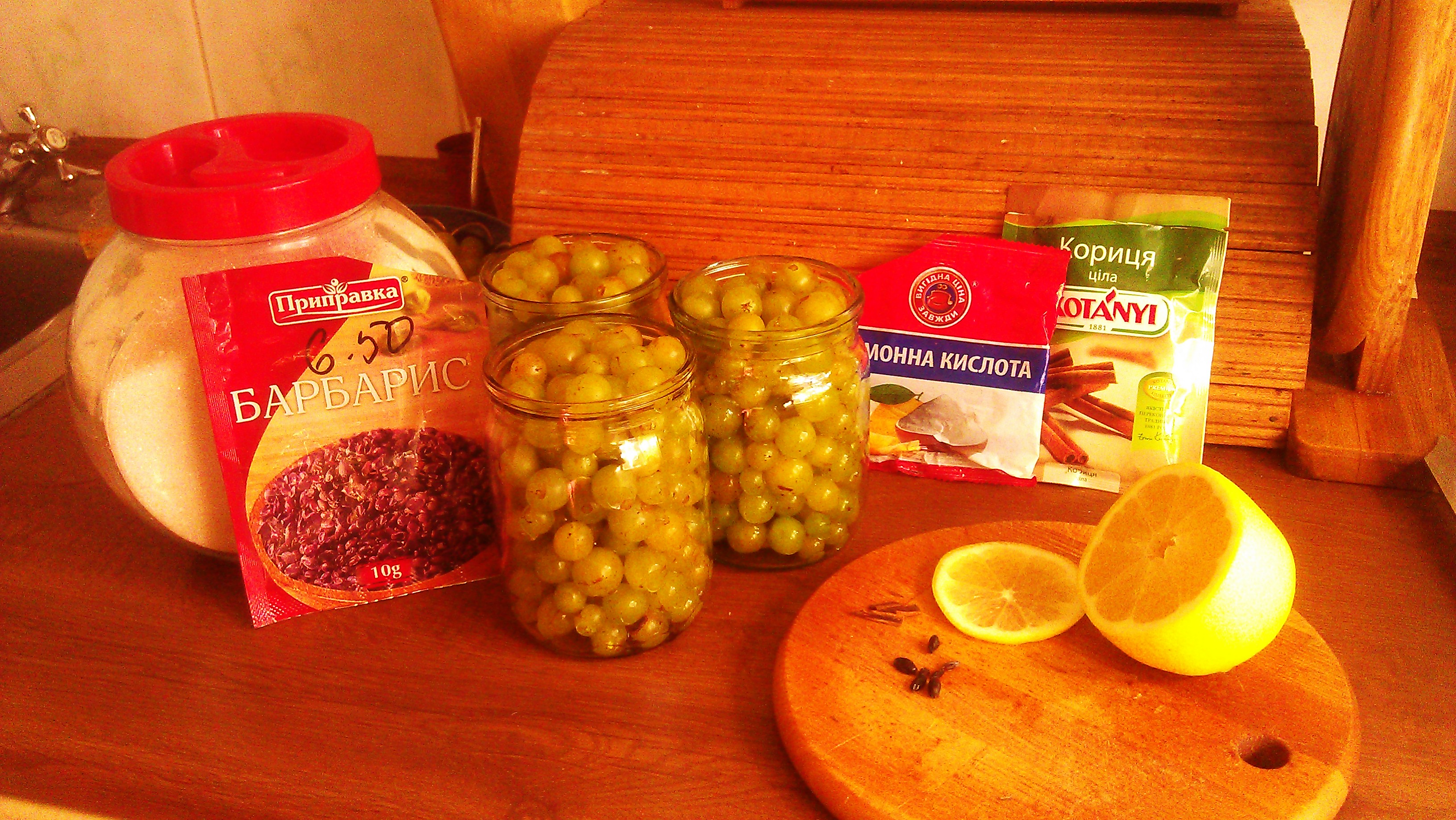 Виноград оборвала от кисточки и помыла. Банки и крышки простерилизовала 10-15 мин. На дно банки положила кружочек лимона, 6-8 шт барбариса, 1/4 палочки корицы (разломала на несколько кусочков, 1 палочка на 4 - 0,5литровых банки), засыпала виноград, сверху высыпала от1/3до1/2 чайной ложки лимонной кислоты и залила кипятком. Дала постоять 1-2 мин. и слила отмеряную на сироп воду в кастрюльку, добавила100мл воды (запас на выкипание) и поставила снова закипать, добавила 20 чайных ложек сахара. После закипания, сироп разлила по банкам и закатала. Рекомендации: пробуйте сироп на вкус перед разливкой, может для кого-то это очень концентрированно, разбавите, но на вкус сироп получился, как натуральный виноградный сок. Спасибо за внимание/thank_you2 и приятного аппетита, надеюсь Вам понравится.