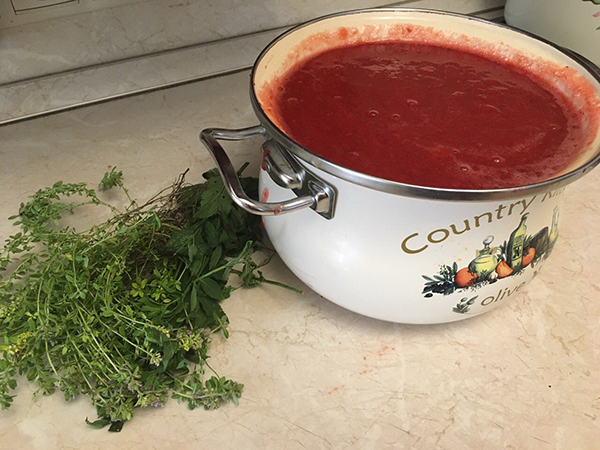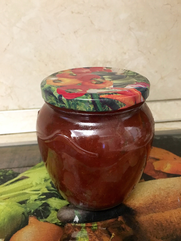 Моем и стерилизуем банки и крышки, соус провариваем уже с зеленью и приправами минут 10-15 (должно хорошо прокипеть!), и кипящий соус сразу разливаю по банкам и тут же закатываю.
