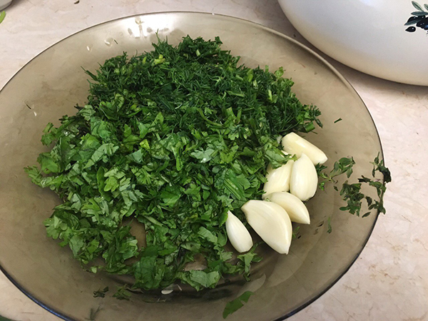 укроп, кинза - по одному пучку (если есть болотная мята (можно и обычную) и чебрец - по пару листочков