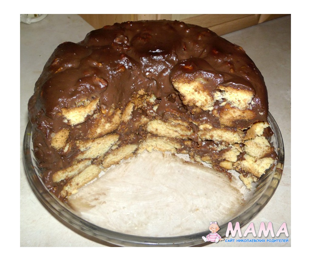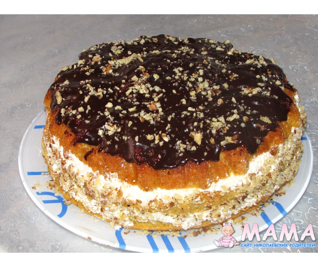 Потім формуєм торт: перемішуєм випечені горішки з кремом і викладаєм гіркою, зверху поливаєм залишками крему і прикрашаєм за бажанням.