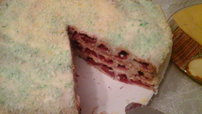 Украсить кокосовой стружкой. Коржи прекрасно пропитываются кремом, торт становится сочным и вкусным. В разрезе торт выглядит довольно эффектно! Подойдет как для семейных посиделок, так и для именинника ко дню рождения.