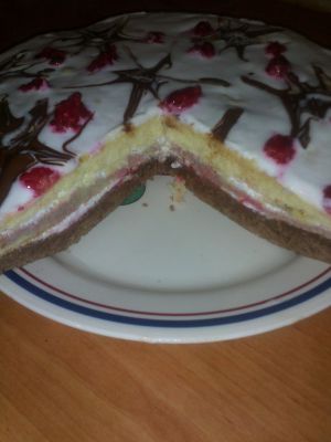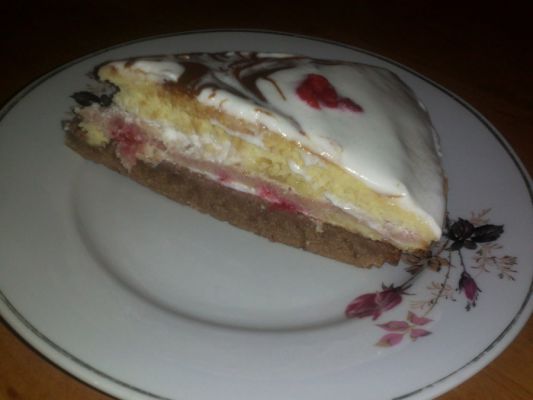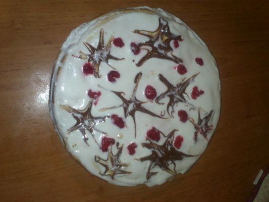 С бисквита срезаем крышку толщиной 1,5 сантиметра, выбираем из бисквита мякоть и отправляем её в крем, оставляем немного крошки из мякоти для посыпки. В результате у нас получилась бисквитная чаша с толщиной стенок 1,5 сантиметра. Дно и стенки чаши слегка промачиваем жидкостью, которая осталась после отцеживания вишни.В миску с кремом и крошкой добавляем отцеженную вишню и всё хорошо перемешиваем. Выкладываем начинку в бисквитную чашу, накрываем крышкой и отправляем в холодильник.Пока тортик наслаждается прохладой, приготовим шоколадную глазурь. В кастрюльку наливаем 180 граммов сливок, добавляем 30 граммов сахара, нагреваем до полного растворения сахара. В миску заранее отвешиваем 150 граммов горького шоколада, наливаем горячие сливки с сахаром и размешиваем, пока шоколад полностью не растает. Продолжаем растирать, пока масса не станет гладкая и блестящая. Добавляем 30 граммов сливочного масла и растираем ещё 4-5 минут.Покрываем торт остывшей шоколадной глазурью. Украшаем по своему вкусу.
