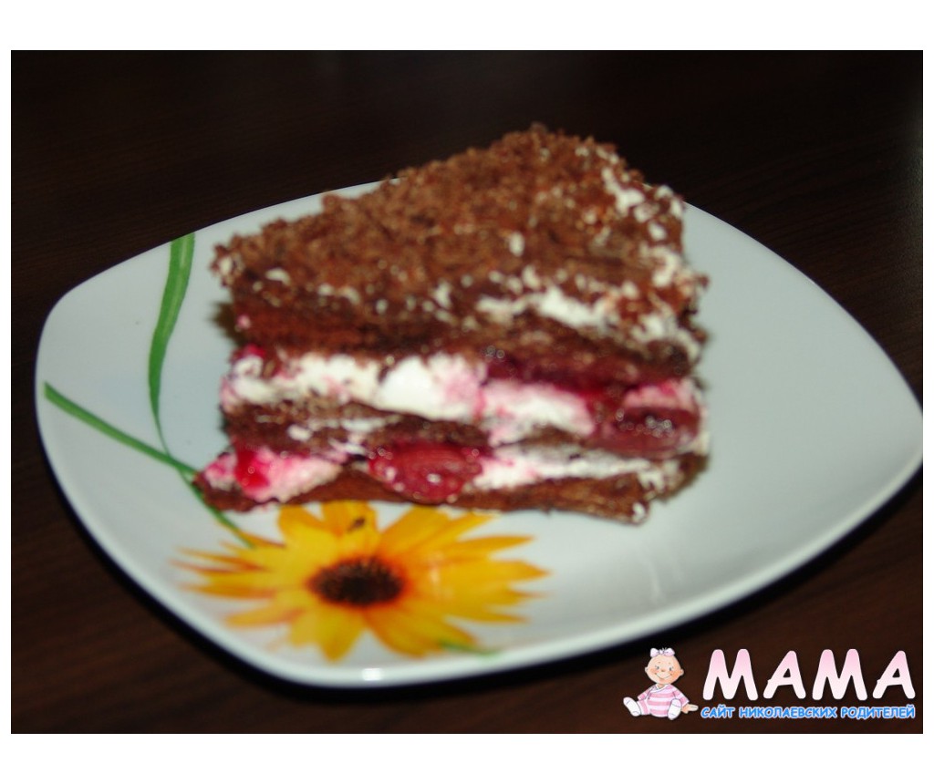 Вообще по рецепту так: корж - сливки - вишни в сиропе - корж - сливки - вишни в сиропе - корж - сливки