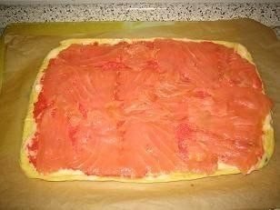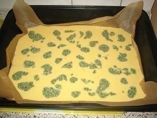 Застелить противень пекарской бумагой и остальное тесто вылить на противень(у меня был 24 на 34 см., если у вас побольше -добавьте ещё одно яйцо )