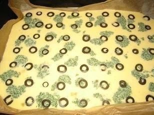 С противня готовое тесто опрокинуть на бумагу — сверху окажется нижняя сторона (сторона с оливками будет снизу).
