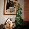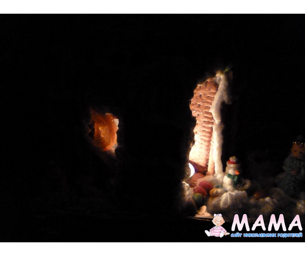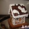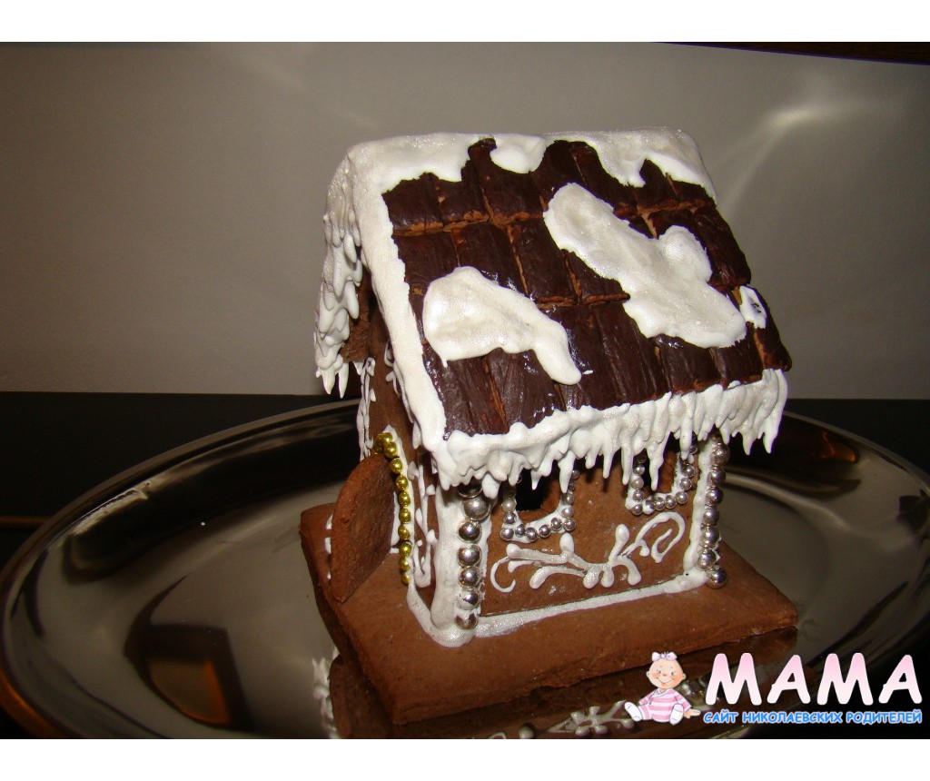 Я нашла подходящую коробку, вырезала окно и дверь, завернула в пищевую фольгу, фольгу обмазала горячим медом (у меня есть испорченный мед), на мед прилепила печенье в несколько этапов, потом на взбитый белок закрепила крышу,когда все застыло, дала сыну в руки кулинарный мешок со взбитым яичным белком ))) плюс конфеты. Во второй заход белок был теплым! перед взбиванием, поэтому получился искрящимся,пористым и пушистым,но тягучим и липким - сугробы получились)))