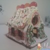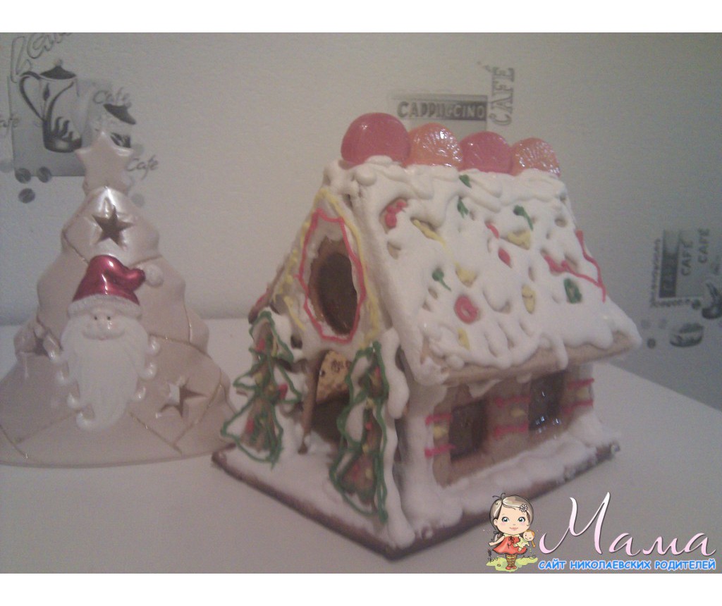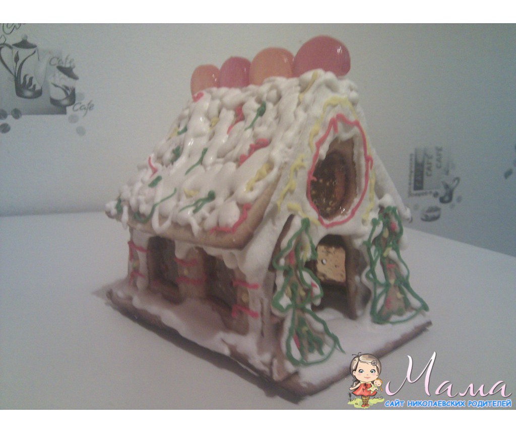 Сначала вставляла окошки из мармелада, затем айсингом (белок+пудра сахарная) рисовала узоры, потом, когда айсинг высох, собирала домик, склеивая детали белым шоколадом растопленным.