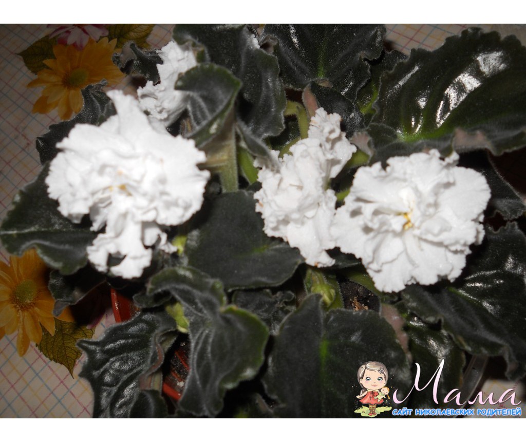 Ира, я люблю все белые фиалки, но они между собой очень похожи. "Свадебный букет" отличается еще и тем, что цветет букетом( на высоких цветоносах, как будто собраны в букетик).Кстате, я тебе высушила желтый цветочек, но он все равно чуть подплесневает. сейчас есть бутон -может успеет зацвести.