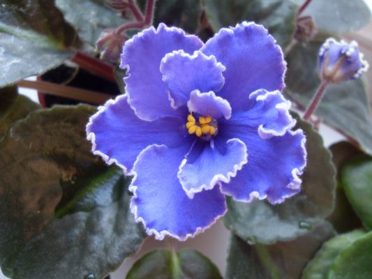 я здесь вижу солнечные ожоги, цветок стоит под прямыми солнечными лучами, а такие листики имеют многие фиалочки, нужно убрать с прямого солнца и подождать цвет (для скорейшего цветения, можно подливать удобрение)