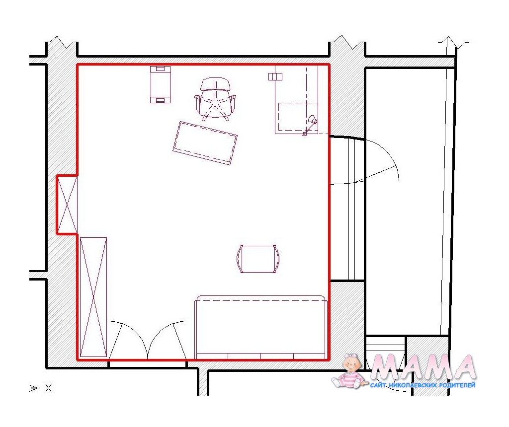 Вот над чем маемся мы. Как объединить зал с "кабинетом" мужа.