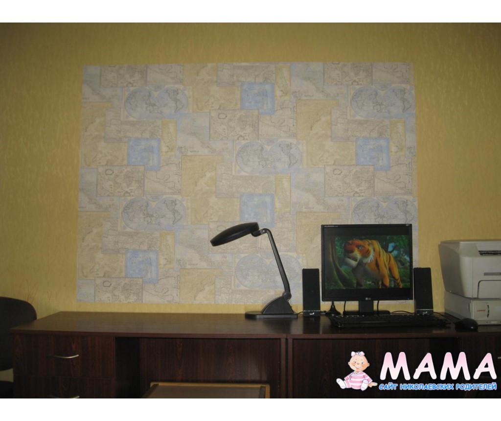 У нас детская в морском стиле, поэтому основные обои взяли - "под небо", очень красивого цвета - бирюзовые с белыми облаками, а на часть стены над кроватью тематические - с кораблями, штурвалами и проч на фоне карты в голубых тонах. Оббегала все магазины обоев практически. В итоге купили на рынке Колос - в самом рынке самый большой магазин обоев.