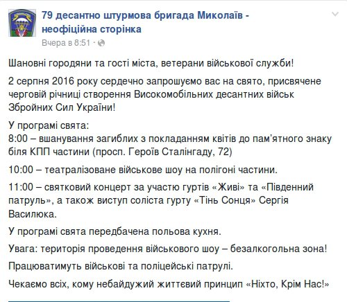 01 August 2016 Николаевская 79-я десантно-штурмовая бригада приглашает жителей и гостей города на военное шоу, которое состоится на территории части 2 августа, в День ВДВ.