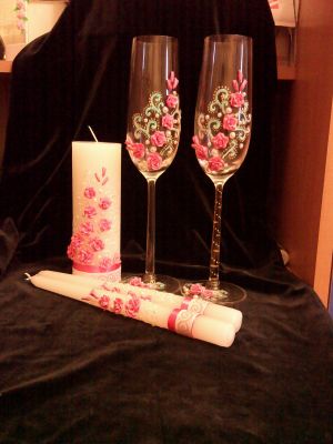 Я робила невістці бокали і букет, але зі штучних квітів. Можу зробити, якщо цікавить, за пару вечорів.(на фото моя робота)