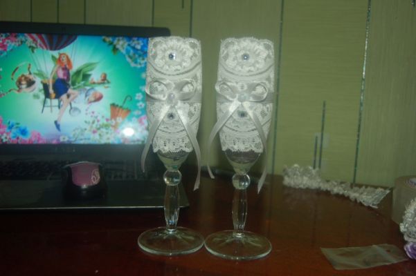 У меня бокалы были хрустальными, с очень красивой гравировкой, а на ножку прикрепила красивый искусственный букетик, не наляписто, но мне очень-очень нравилось!
