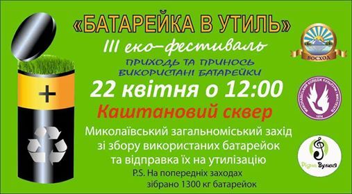 В Николаеве пройдет экологический фестиваль «Батарейка в утиль». Он стартует в 12:00 22 апреля и заключается в том, что каждый желающий сможет сдать на утилизацию батарейки. Об это интернет-изданию «Мой город» сообщили организаторы акции.