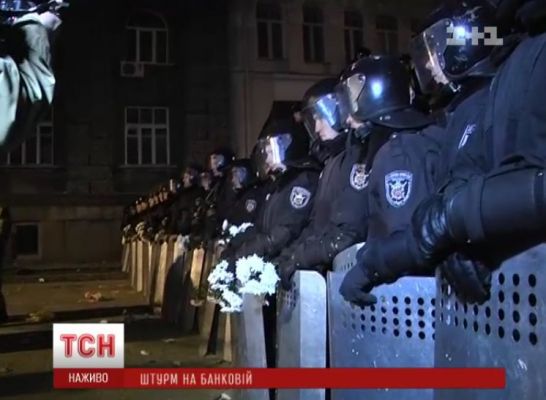 По сравнению с дневным штурмом, обстановка вокруг довольно спокойная. Некоторые беркутовцы, стоящие в первых рядах, держат в руках белые хризантемы.