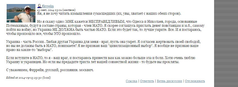 Братишка написал(привожу перевод): К сожалению, я много знаю о России. Намного больше, чем мне хотелось бы. Я знаю то, что Россия украла у меня Родину. Я знаю то, что Россия отправляет наемников и снабжает террористов, которые уничтожают Донецк и Луганск. Я знаю, что для России — все враги и лжецы, и лишь из её уст льётся правда матка (Dmitriy Kisilev forever). Я слишком много знаю о России. И я бы очень хотел не знать этого, но вы не спрашивали разрешения.