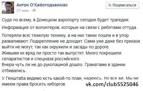 даунбасовцы в одноклассниках мне уже нахвастались, что аэропорт взят. радостно вопят, чтоб мы встречали груз-200.