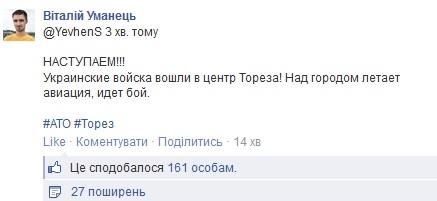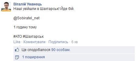 Активіст Віталій Уманець написав, що українські сили просто зараз увійшли до Шахтарська і Торезу. Очевидно, що з боку Макіївки.