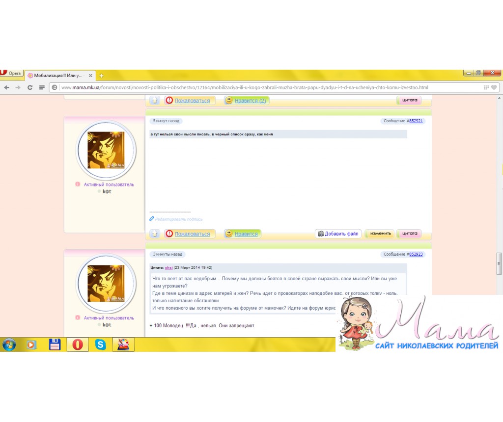 это ваши выдумки и пропаганда по телеканалам! Мне звонили с Севастополя у них все ок поднялись они из-за языкового закона, а все могло быть совсем по-другому. Не переживаете ли вы, столь смелые дамы со своими откровенными высказываниями, что может все пойти совсем иначе и вам прийдется за свои слова отвечать? кроме вашего мнения есть иное и имеет право быть, но я поражена вашей смелостью либо глупостью выражать это на форуме в таких красках. Я свои убеждения выражаю в кругу своей семьи, где уверена, что никто не предаст. А почему тут с вами общаюсь, потому, что поразили ваши циничные высказывания в адрес матерей и жен, которые проводили своих близких в части и не по наслышке знаю, что сидят и ревут, что продлили их службу, а вы с мужьями под боком сидите и строчите.Уделите внимание детям, мужьям вместо этой бессмысленной писанины сколько людей столько мнений Лично я из общения с вами ничего полезного для себя не вынесла, а многие ники пестрят глаза. И напоследок- из-за пыли в глаза с выдуманной войной вы не заметили, видалено, а насколько я информирована большинство мамочек на них живут... и еще в евросоюзе хлеб стоит 3 евро пиво 4 евро а коммуналка 500 евро Всем удачи!