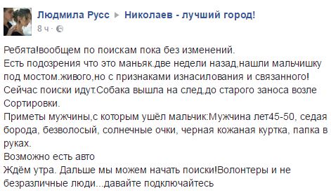 Губернатор Николаевщины Алексей Савченко, получив сообщение об исчезновении 10-летнего мальчика, мгновенно организовал поисковые действия, привлекая вооруженные силы региона и общественные объединения.