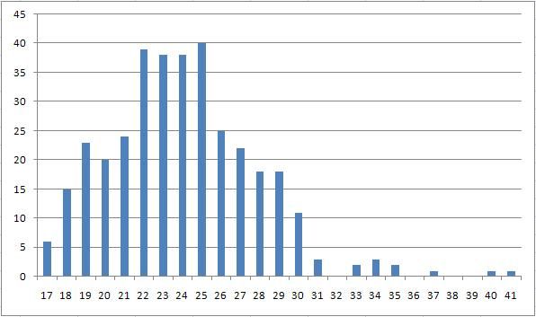Називається, мені не було чого робити... Тримайте статистику (горизонталь - вік, вертикаль - скільки наших форумчанок стали мамочками вперше в такому віці):