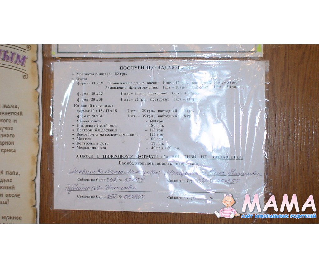 .... в итоге они снимали на мою видео камеру (в пеленальной, около 2-3мин) за что взяли 120 грн. В самой комнате выписки снимал я и параллельно своей - парнишка-видеооператор, а так же девочка-фотограф... После идиотской церемонии с тупыми вопросами, вручения бумажек, типа паспорта новорожденного и грамоты самых лучших родителей, а так же какой то медальки.... за все это еще около 200 грн.
