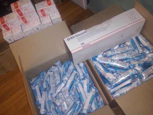 Сегодня привезли 2 коробки бинтов: больших 7х14см -200шт. и маленьких 5х10см - 300шт, упаковку шприцов 5мл - 100штук и спиртовых салфеток 10 пачек по 100штук в каждой, от Ирина Сущенко. Спасибо, Ире и Олегу!