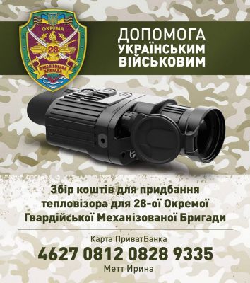 Сбор по сути стоит уже вторую неделю, ребята, тепловизор ну очень-очень нужная вещь, сами ребята из 28-ой говорят "не надо нас кормить, не надо нас одевать, дайте нам чем воевать". Тепловизор - возможность избежать засад, сохранить сотни жизней. Пожалуйста, давайте активизируемся, кто может - деньгами, каждые 10 грн важны, кто может - репостом.