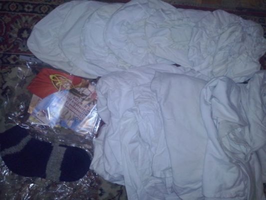 Пришла посылка из Одессы от Ссылка: 7 каверов (чехлы на каски), выкройки на каверы, белая тканюшка на маскхалаты и носочки, связанные бабушкой! Как мило! Спасибо, Егор, тебе! И бабушке спасибо огромное и здоровья крепкого! Нас нельзя победить, с такими-то бабушками!