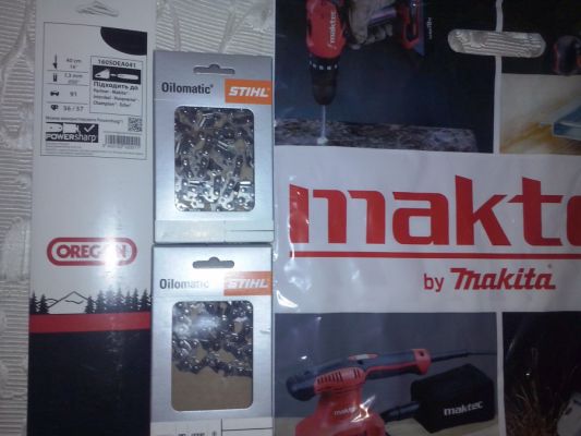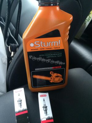 - Запчасти на бензопилу : 2 свечи, 2 цепи штилевские, масло моторное и масло для цепи штилевское, шина.