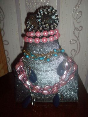 Сегодня свои обалденные работы передала Ссылка... (бусы, цепочку, браслеты и детские резиночки)я сделала подставку для украшений, так смотрится нагляднее.