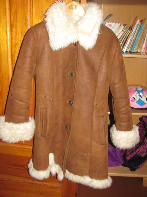 Есть дубленка на цигейке в хорошем состоянии, коричневого цвета. На рост наверно где-то 130 см.