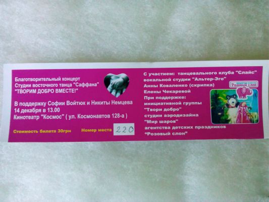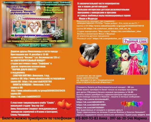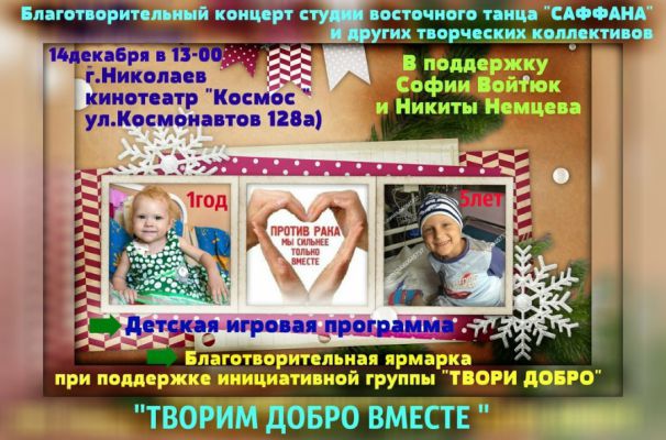 Приглашаем вас 14 декабря в 13-00 в кинотеатр "Космос" ( ул. Космонавтов 128-а ) на БЛАГОТВОРИТЕЛЬНЫЙ КОНЦЕРТ студии восточного танца "Саффана" и других творческих коллективов "ТВОРИМ ДОБРО ВМЕСТЕ! " в поддержку: ❤ СОНЕЧКИ ВОЙТЮК г.Николаев, 1 год. группа в ОК:Ссылка группа ВК : Ссылка ❤ НИКИТЫ НЕМЦЕВА г. Николаев, 5 лет. группа в ОК: Ссылка группа ВК :Ссылка