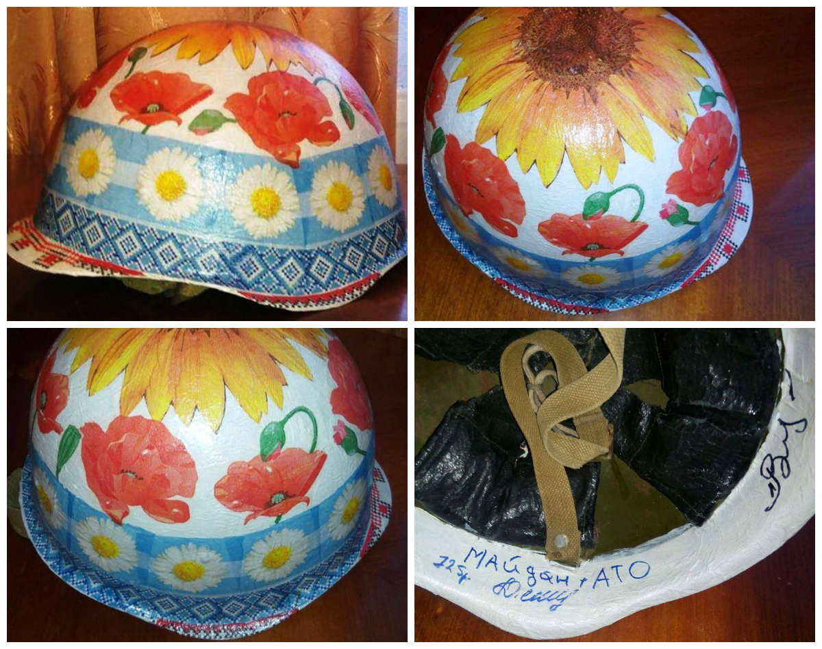 Унікальний і неповторний лот передали нам сьогодні. Військова каска, що належить Юрію Солов'ю, воїну 72 бригади. Повернувшись з АТО додому, він віддав цю каску в умілі ручки майстрині Олени Воровської, а вона вже зробила з неї таку красу. Каска прикрашена за допомогою техніки декупаж, ручна робота, всередині каски є підпис від бійця. Це каска-оберіг, пройшла цілий рік війни з бійцем, побачила і відчула на собі "всі красоти АТО". Слава Богу, боєць живий і здоровий, можливо навіть завдяки цій касці.