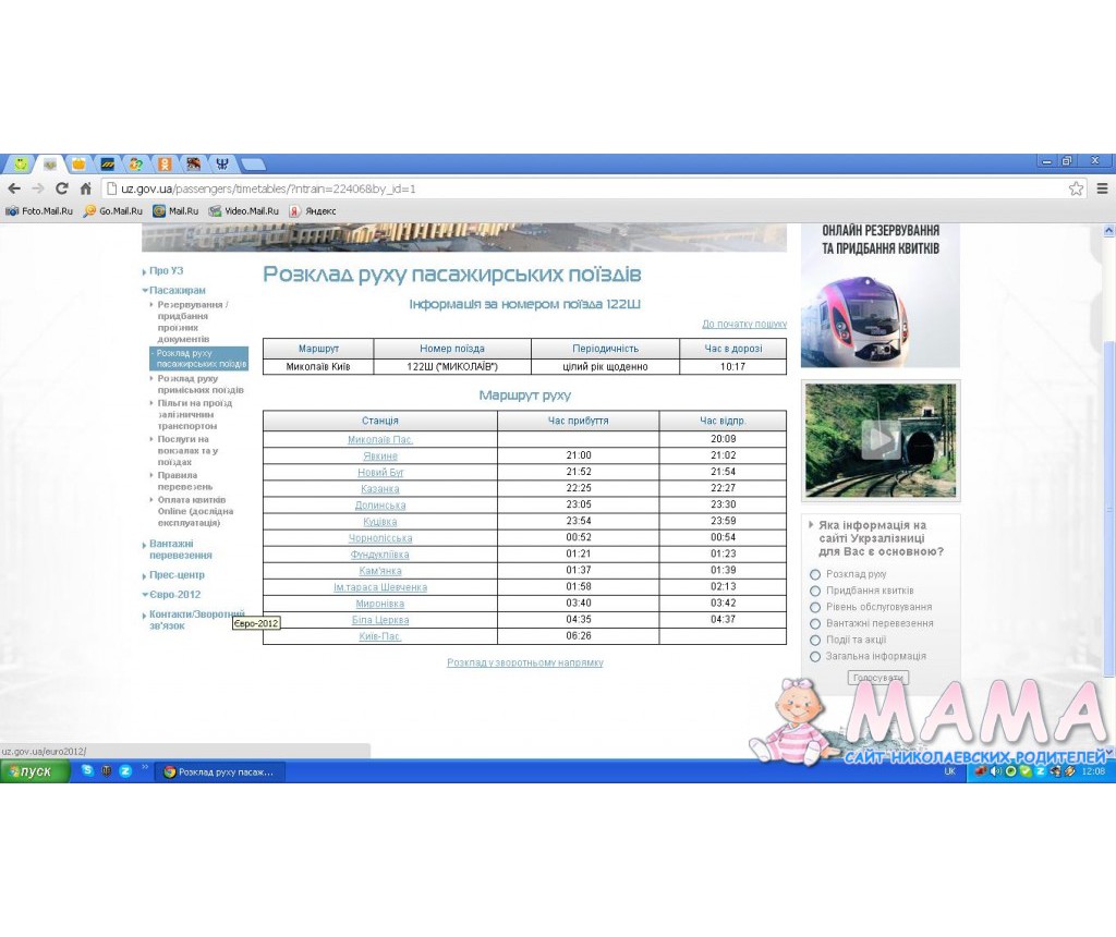 Девочки,неужели вернули поезд Киев-Николаев на прежнее время,7 часов вечера?Кто недавно ездил?Нам сегодня доктор такую новость сообщила.Я на радостях на сайте посмотрела,где расписание.а там 12.26.А где резервирование билетов-19(минуты точно не помню).Вот и не знаю-радоваться или нет