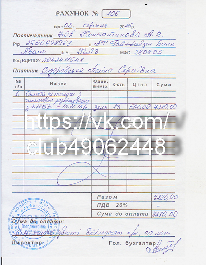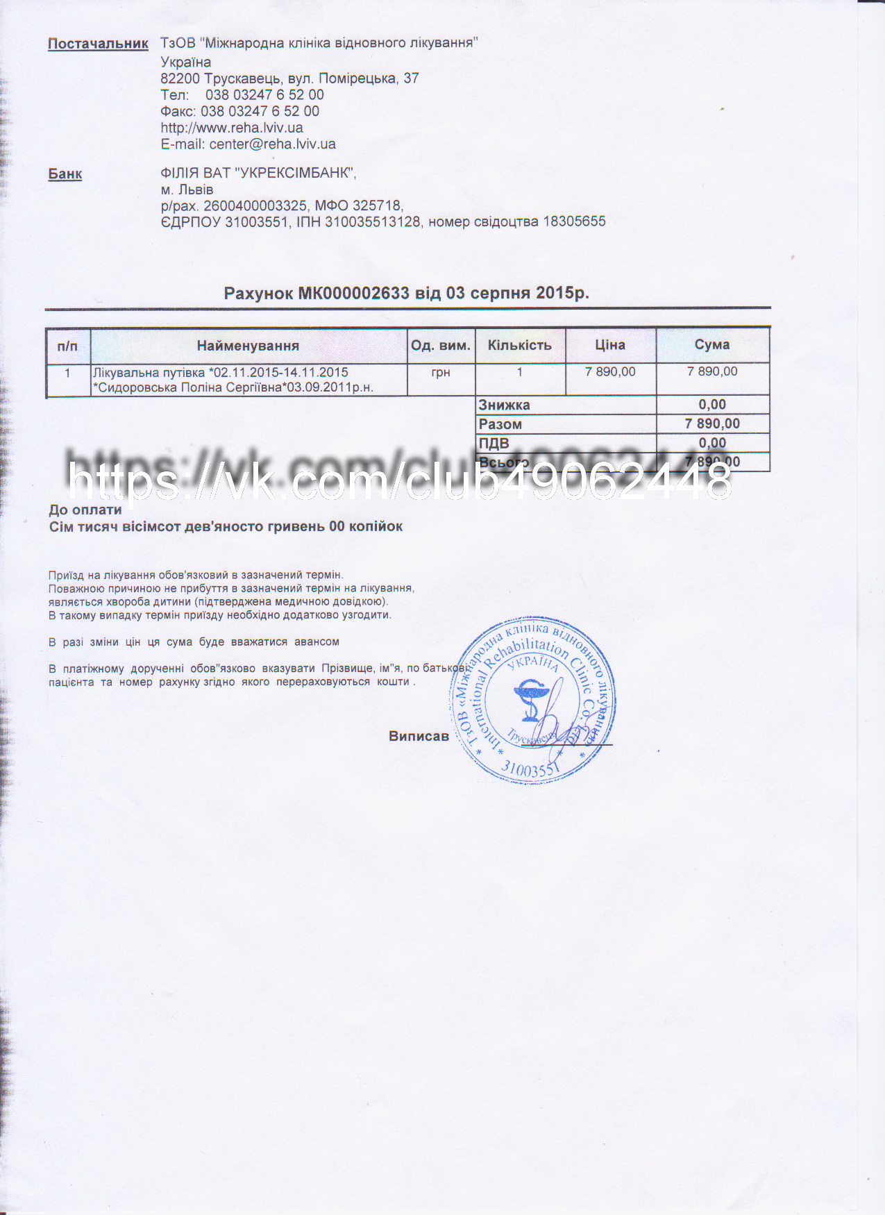 Счет на лечение - 7890 грн - оплата 4 курса лечения