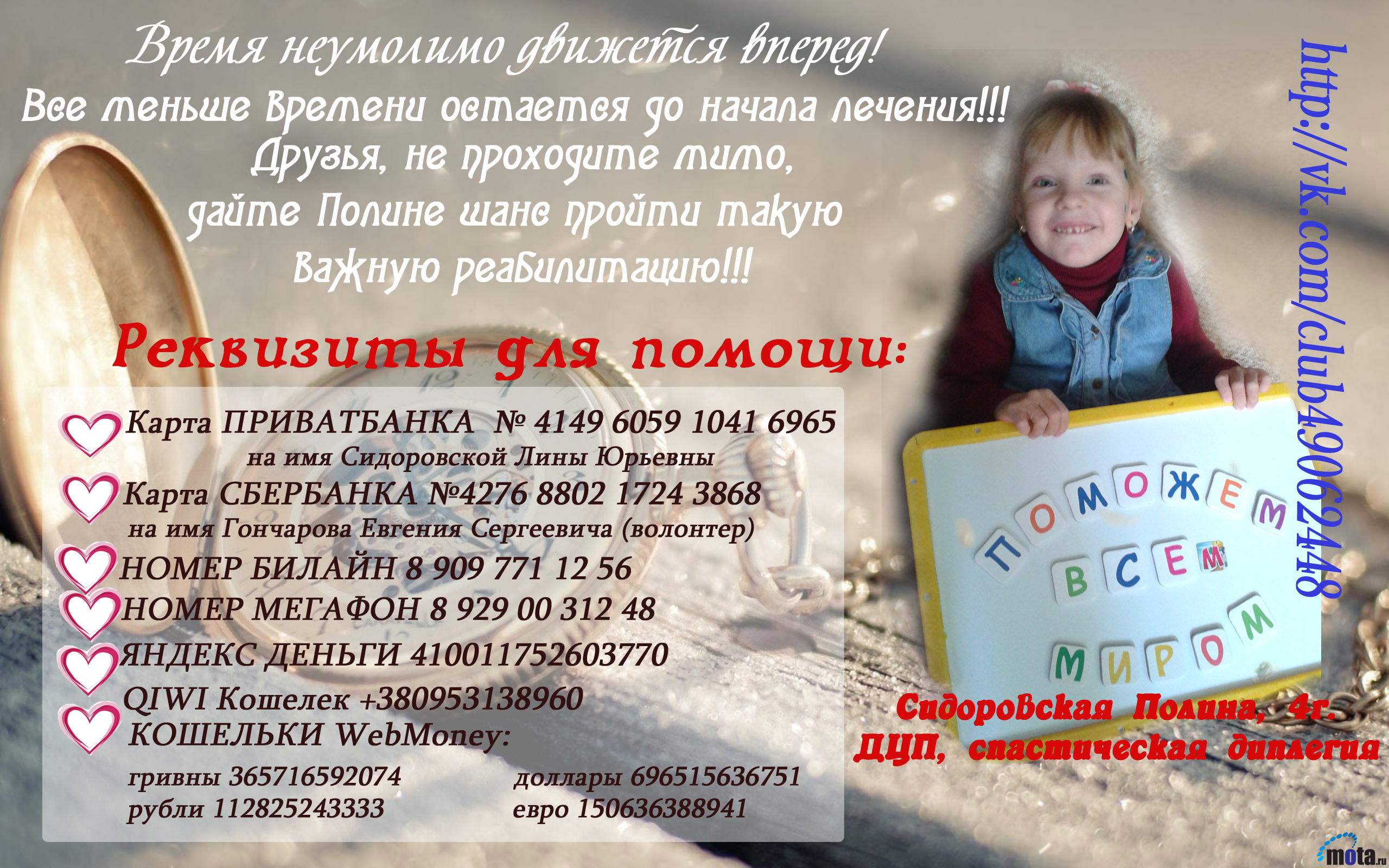 05.04 +1000руб на карту СБ от Анны Анатольевны Т с подписью,,Здоровья Полиночке, сил маме!,,. Сердечное спасибо Вам за неоднократную помощь!
