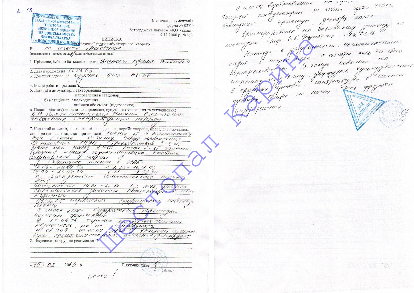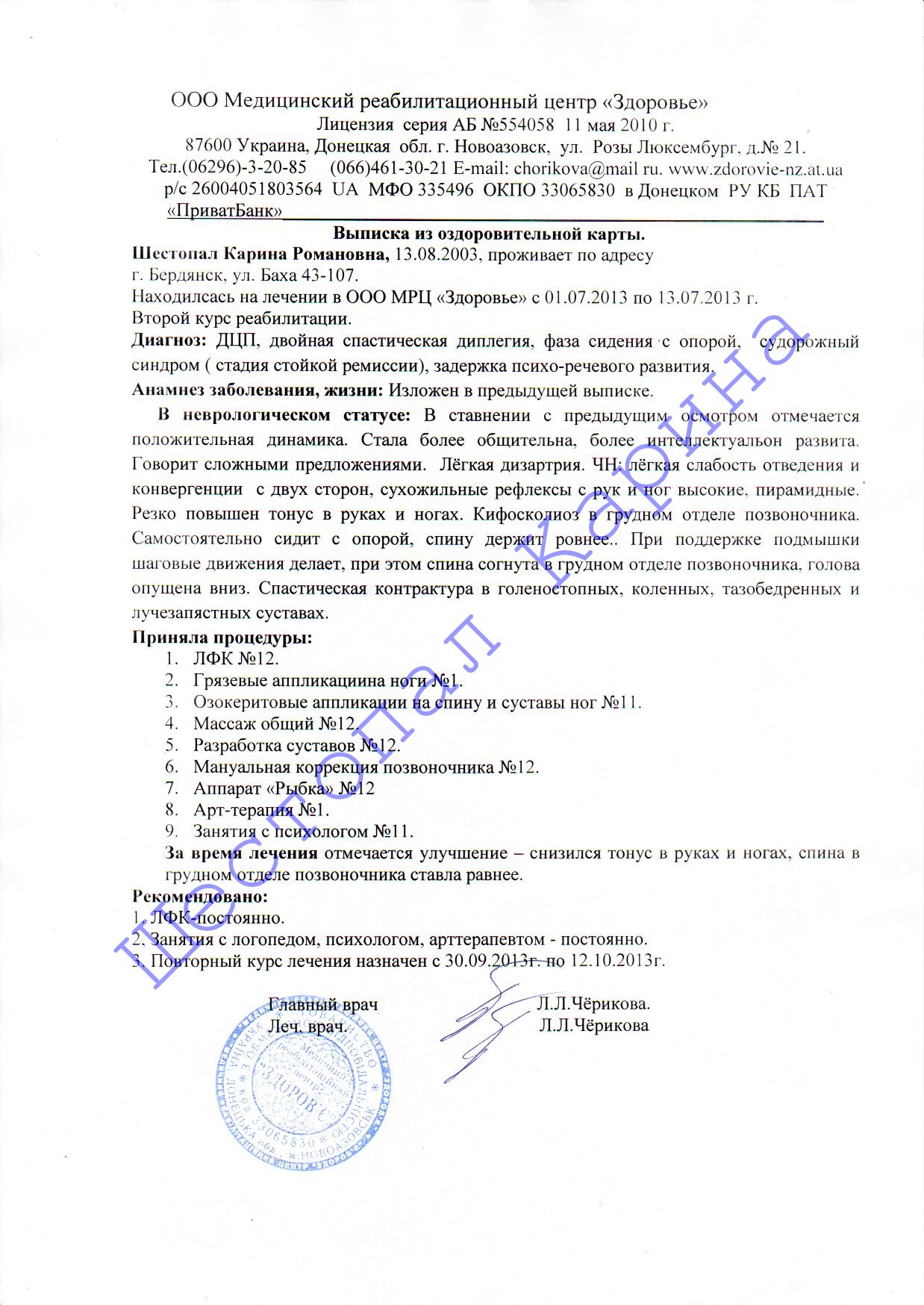 Я посылаю Вам все документы, выписки из нашей больницы и выписки после прохождения курсов реабилитации в Новоазовске. По ним сразу видна положительная динамика после лечения.