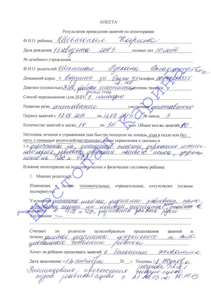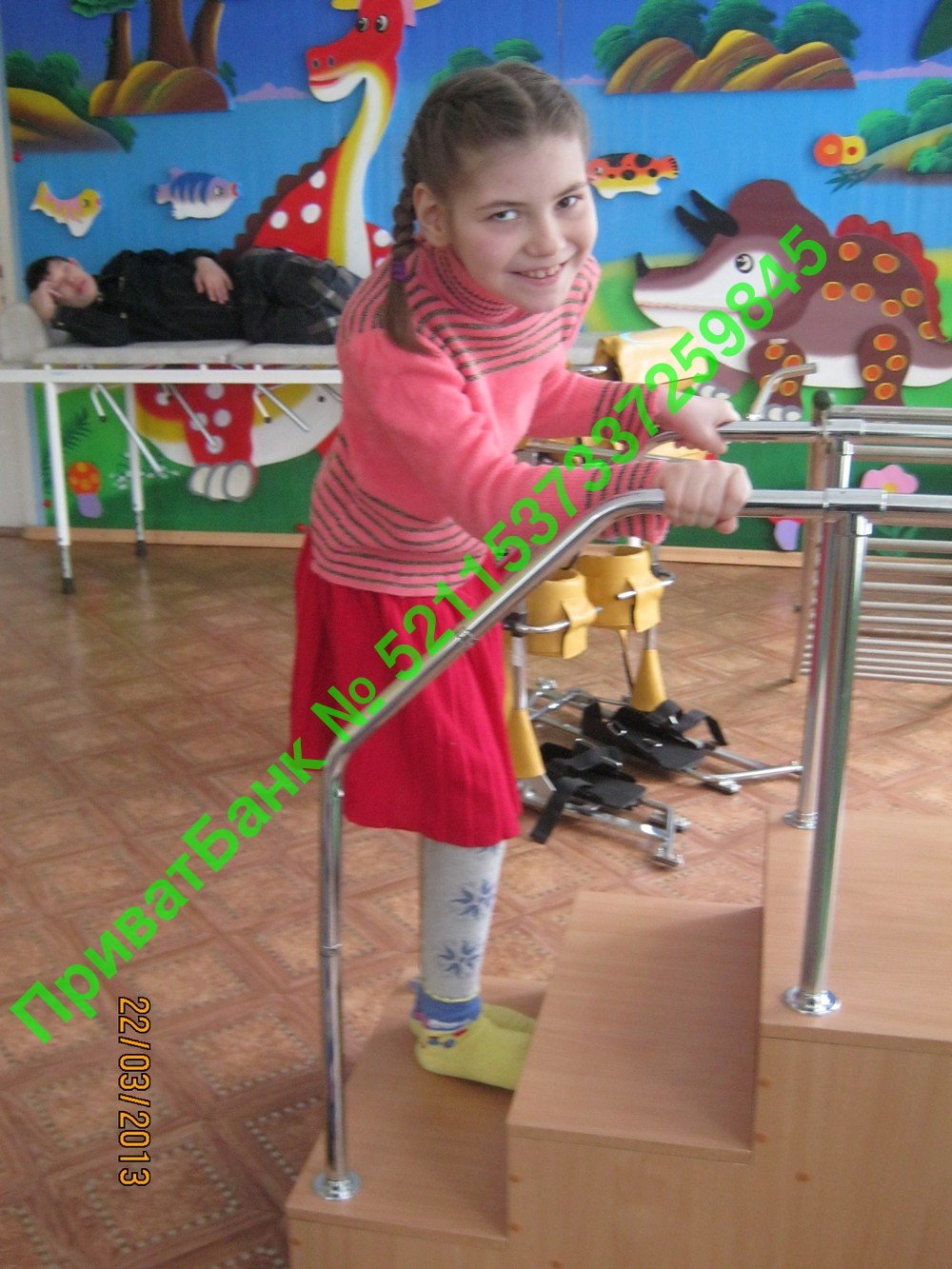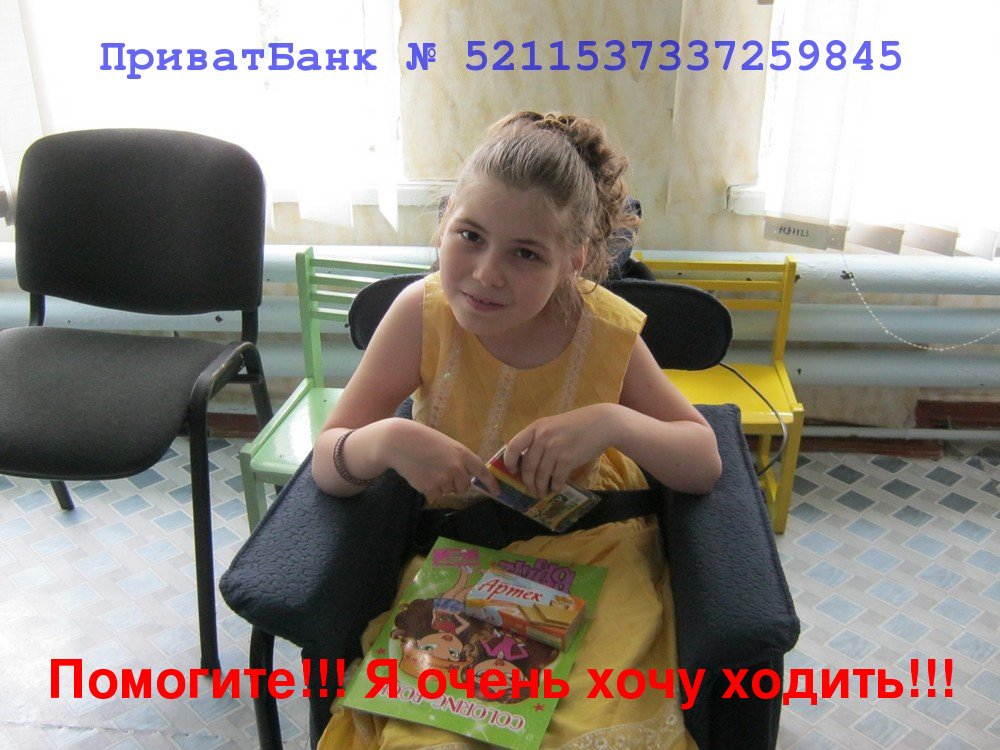 В 2012 году Карине сделали первую операцию тульских подрезок. Операцию сделали в январе, а в сентябре она самостоятельно стала сидеть. Это очень хороший результат. После этого я поняла, что шанс на выздоровление есть и надо идти дальше. Я начала искать спонсоров на вторую операцию (сумма одной операции 8950 грн+ дорога), а потом и на последующие реабилитации. Мы начали усиленно заниматься только с начала этого года. И то благодаря тому, что нам подарили в феврале этого года компьютер и появилась возможность рассказать о истории Карины. Но не смотря на то, что мы так мало занимаемся у нас есть уже прогресс. Карина уверенно стала держать спину, ее мышечный тонус намного уменьшился, она стала намного лучше разговаривать. У нее есть шанс пойти. Мне это говорит и лечащий врач и инструктор по ЛФК в реабилитационном центре "Здоровье" в Новоазовске (Карина прошла там уже 2 курса реабилитации - в апреле и в июле; следующий курс в октябре. Стоимость курса 6500 грн. Октябрьский курс реабилитации в центре «Здоровье» нам оплачивает ассоциация «Эммануил»). Я и сама вижу по дочке, что результаты лечения есть. Главное не останавливаться и идти постоянно вперед. В мае, июне и сентябре мы проходили с ней курсы иппотерапии. Именно после этих курсов у Карины лучше стала осанка. Она стала намного дольше сидеть самостоятельно. Следующий курс иппотерапии назначен на 21 октября, а денег нет. Сумма курса 1800 грн+1000 грн дорога. Центр иппотерапии находится у нас за городом. Мы можем к сожалению доехать туда только на такси. А это получается 100 грн в день. И плюс к этому у нас назначен следующий курс реабилитации в Новоазовске с 9.12.2013 г. по 21.12.2013 г. Это еще 6500 грн на лечение в центре и приблизительно 500 грн на дорогу. Поэтому необходимая сумма для лечения в данный момент составляет 9800 грн. (38790 руб.). Для меня это очень большие деньги. Особенно если учесть то, что я одинокая мама и у меня самой нет родителей. Вот и прошу Вас люди добрые о помощи. Дайте моей дочери шанс пойти. Ей уже 10 лет и нам очень важно не упустить время. У нас с ней только одна НАДЕЖДА - это ваша помощь и поддержка.