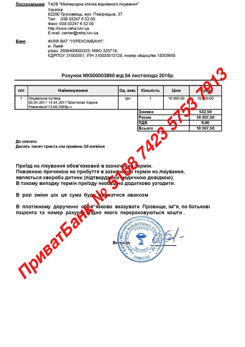 Вот счет на реабилитацию. Как видите сумма реабилитации значительно увеличилась. Так что будем надеяться, что нам хватит на все предстоящие расходы (курс, дорога, съем квартиры, питание).