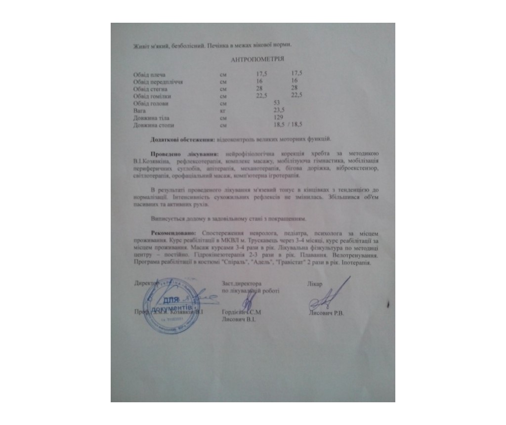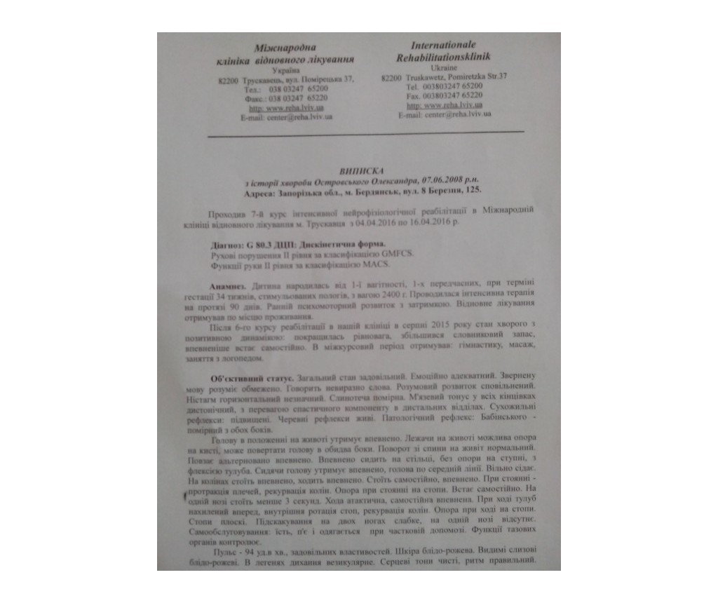 Дорогие, друзья! Благодаря Вашей помощи САШЕНЬКА прошел 2 курса в МРЦ Здоровья, 7 курсов в Международной клинике восстановительного лечения. Для получения результатов требуются занятия со специалистами, постоянная реабилитация, нельзя делать длительный перерыв между курсами лечения. Следующий курс в МКВЛ назначен на 22 августа 2016г.