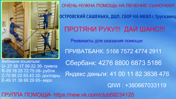 Сложно быть родителями "особенного " ребенка. Но вы представьте хоть на минутку, как сложно быть "особенным" ребенком! Не проходите мимо беды больных деток, ведь мы им так нужны! Никто им не поможет, кроме нас...Задумайтесь сколько в день мы тратим денег на ненужные и бесполезные вещи! А ведь эти деньги кому -то могут спасти жизнь или подарить детство!!!